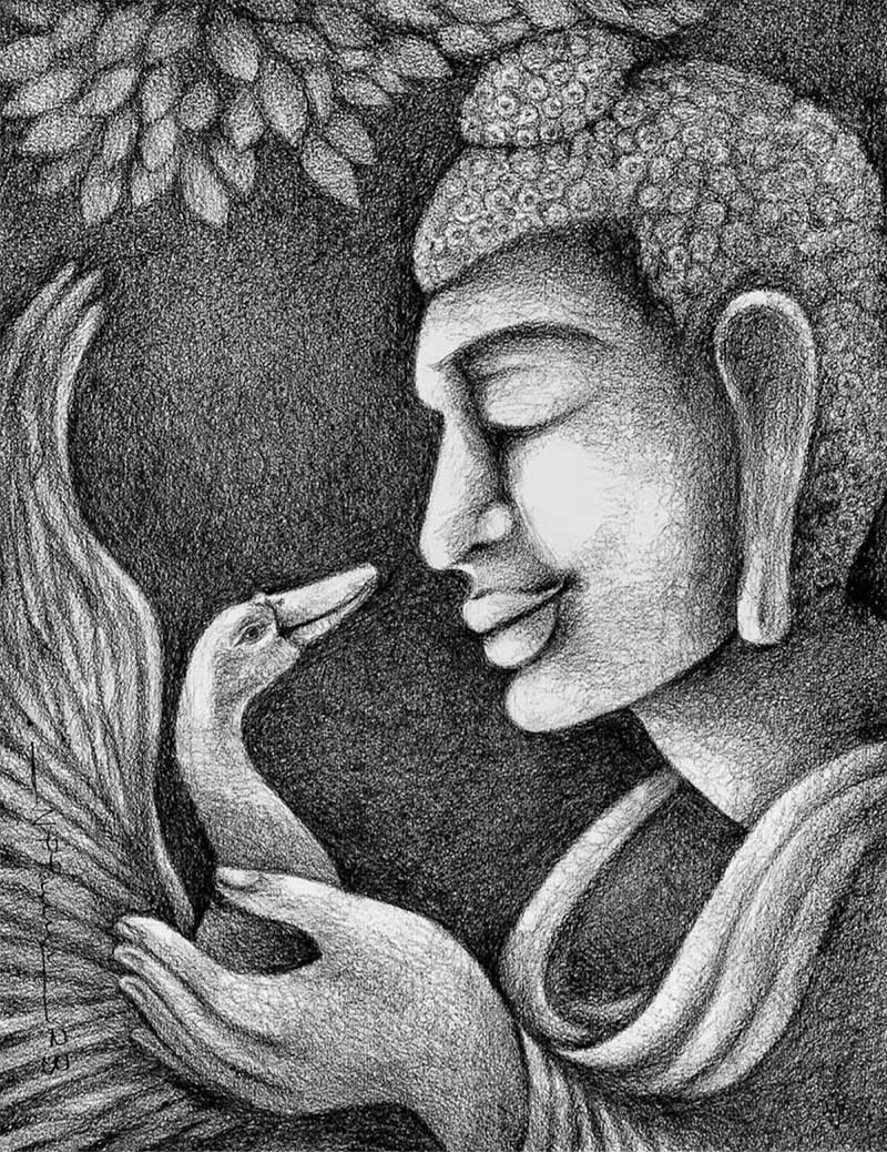 N P Pandey, ‘Buddha with Bird’ Charcoal on Paper, 24×20 Inches, 2023, ₹ 15000