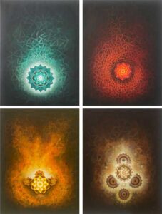 Iconographic interpretation of the divine force inspires the artist. The elephant God emerges out of a very sublime horizon. Ganesha symbolizes the divine force that surrounds the human form, which he does not always notice. Abstraction in form and textural backgrounds adds that mystical air to her works.